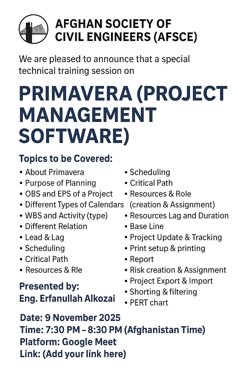We are pleased to announce that a special technical training session on Primavera (Project Management Software) will be conducted by Engineer Erfanullah Alkozai.