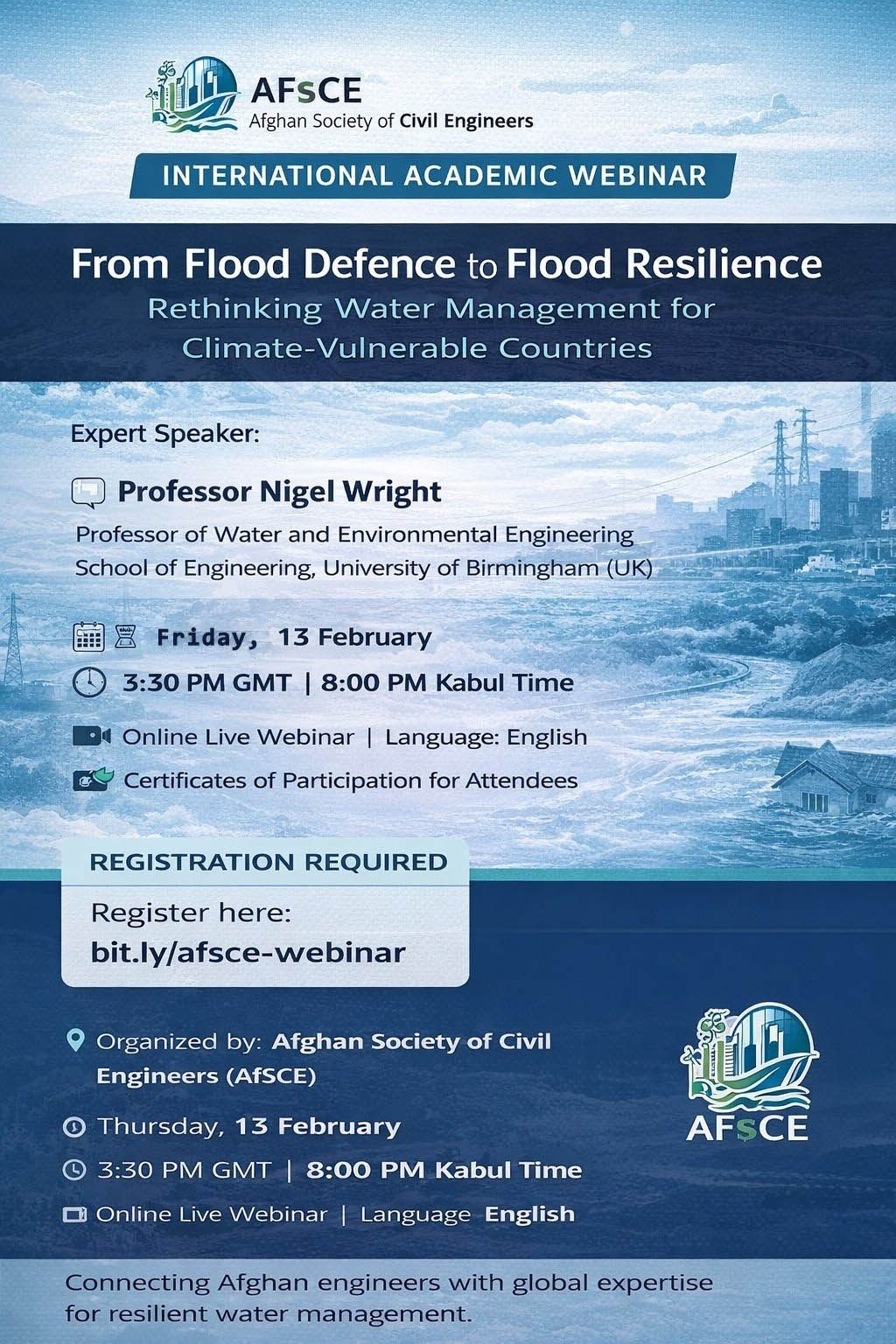 The Afghan Society of Civil Engineers (AfSCE) is pleased to announce an upcoming international academic webinar delivered by Professor Nigel Wright, a leading expert in water and environmental engineering from the University of Birmingham, UK.
